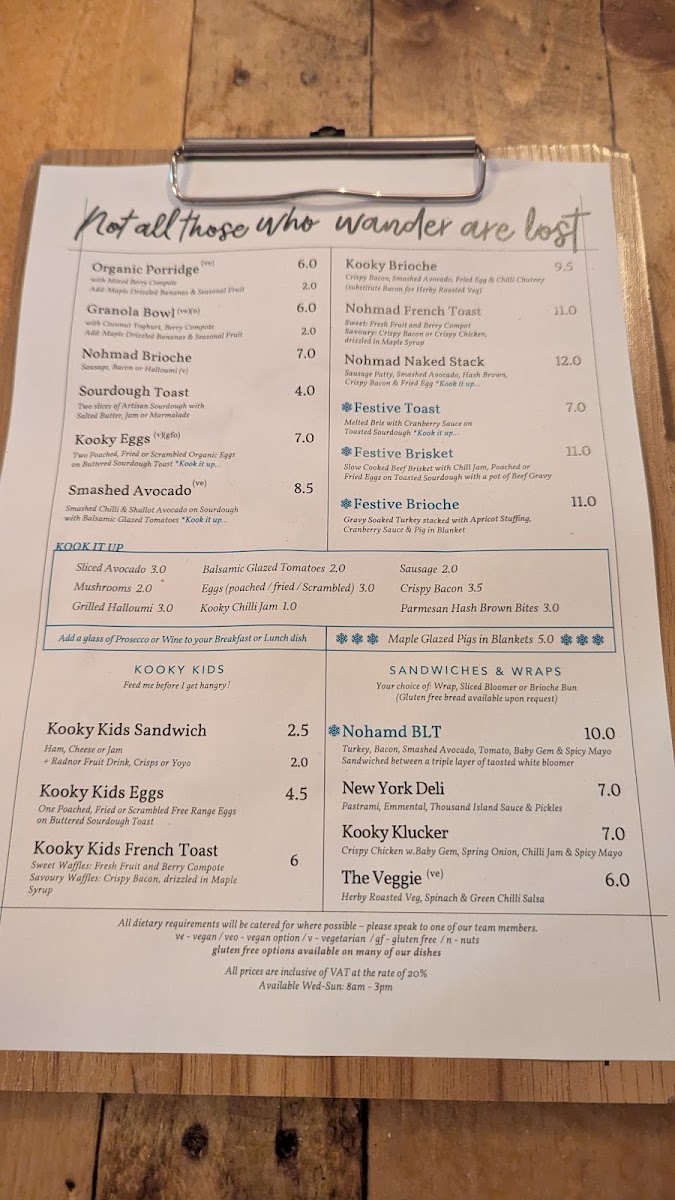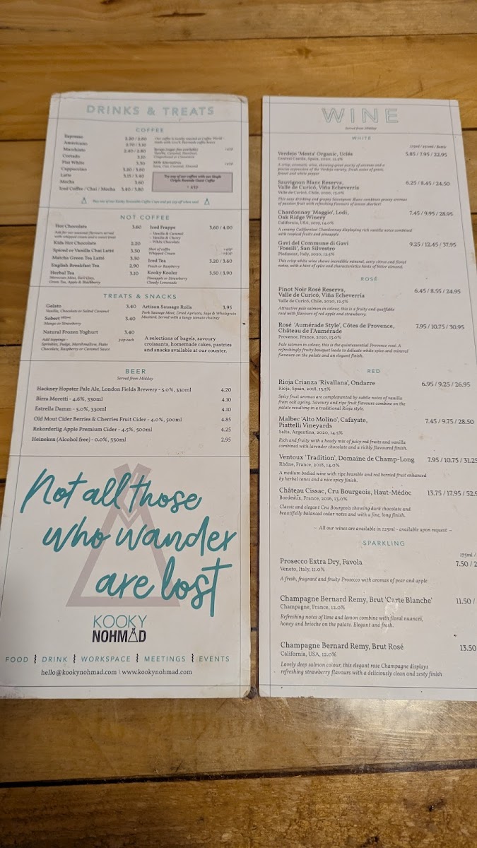 Welcome to Kooky Nohmad, a hidden gem located at 42 High St, Royston, offering a vibrant blend of flavors and a commitment to sustainability. The menu is a delightful array of options that caters to both vegan and non-vegan diners. For health-conscious guests, the Hummus Wrap and Spiced Chickpea Salad are must-tries. Meat lovers will enjoy the No Hmad Special, featuring a savory Turkey Chilli Con Carne paired with crispy Kooky Tortilla Chips.